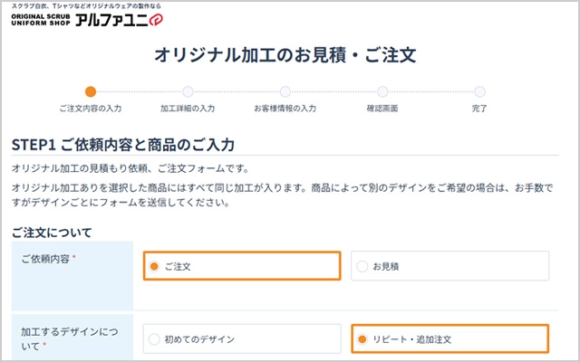 以下のフォームからお客様情報やお支払い条件、ご検討のスクラブ品番とカラーなど、現時点で決定している項目をご入力下さい。