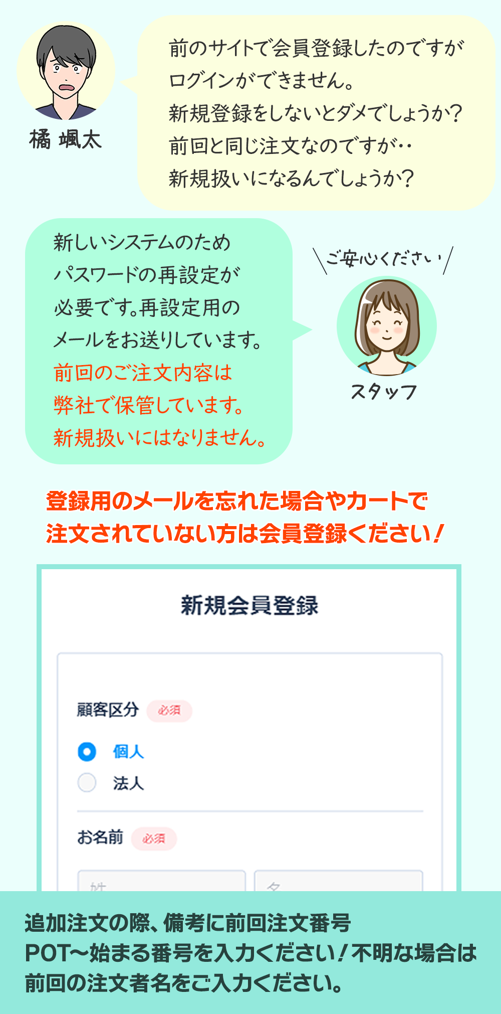 前回の注文内容を確認されたい場合、ご注文番号が分かるとスムーズに対応ができます。(POT+番号)をお知らせください。