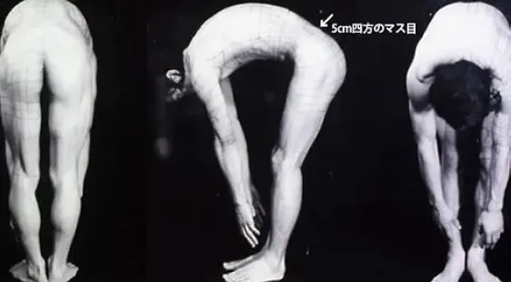 人体に5cm四方のラインを引き、運動することによって、皮膚がどのように動くかを研究しました。
