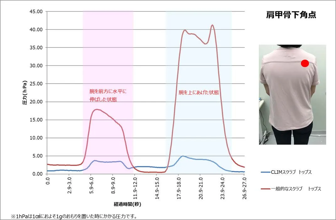 CLIMスクラブは、腕を前方に水平に伸ばした時、腕を上にあげた時の肩甲骨下角点のツッパリ感が一般的なスクラブよりも少ないです。とくに腕を上にあげた時の違いが非常に大きいです。