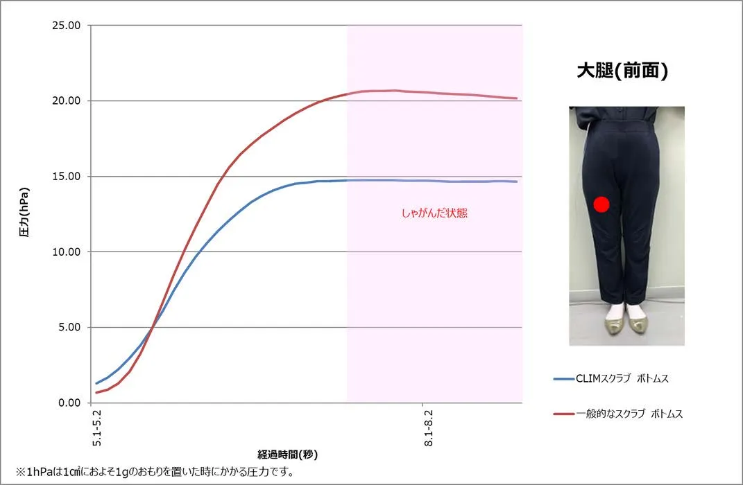 CLIMスクラブのボトムスは、しゃがんだ時の大腿(前面)のツッパリ感が、一般的なスクラブのボトムスよりも少ないです。