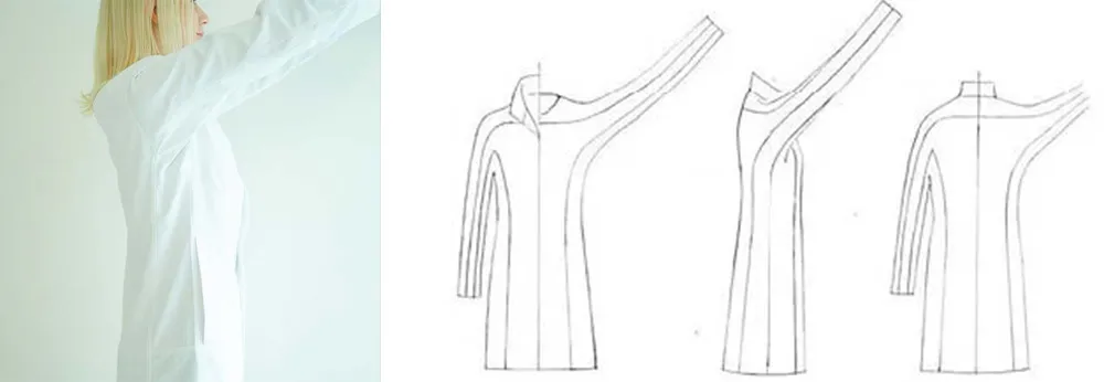 皮節構造線に合わせてパターンを作成することで、皮膚と同様の構造のパーツづくりが可能になります。必要な運動量を設計の中に取り込むことが可能です。医療従事者の普段の動きの中より運動量を計算し、CLIMブランドのメディカルウェアは設計されています。