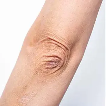 皮膚自体にストレッチ性はないため、伸びた部分は皮膚に刻まれているシワによるものです。下半身で身体の動きによる皮膚の変化が最も大きいのが、足の付け根、後ろの殿溝部分です。