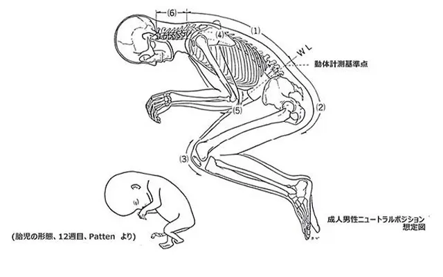 立体裁断がボディの形に合わせて設計を行うのに対し、動体裁断®では、関節が自然と屈曲している胎児の姿勢をニュートラルポジションとして、設計を行う際の基本姿勢としています。