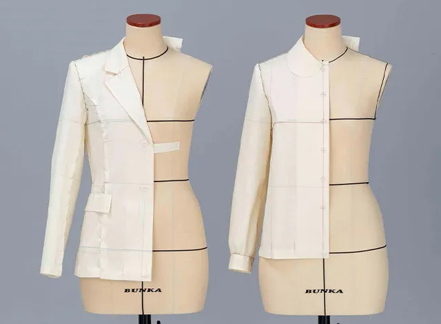裁断方法には、紙の上で寸法に基づき決まった計算式を用いて設計を行う「平面裁断」や、ボディの形をした人形に布を貼り付けていき、立体的に設計を行う「立体裁断」といった方法があります。※CLIMの製品にはこれらの方法は採用されていません。
