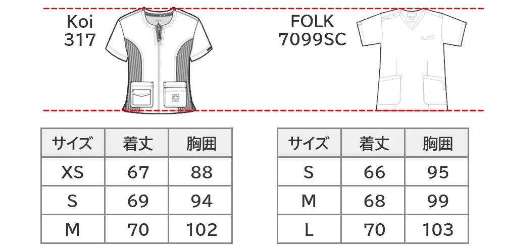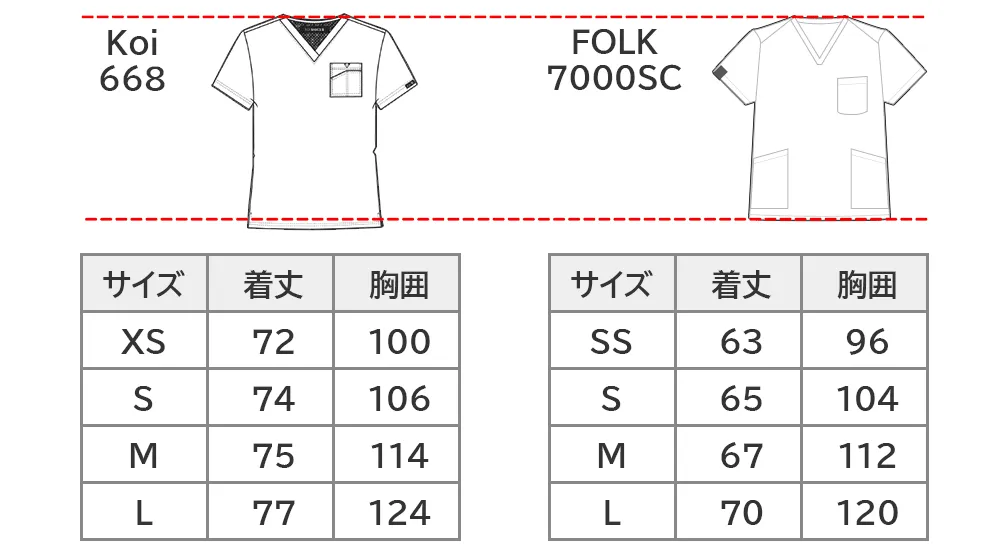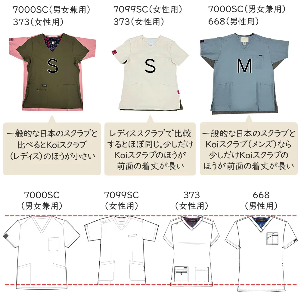 一般的な日本サイズFOLK 7000SCスクラブ(男女兼用)と比べるとKoiの668ブライアンメンズトップ(メンズスクラブ)は着丈が長めに作られています。