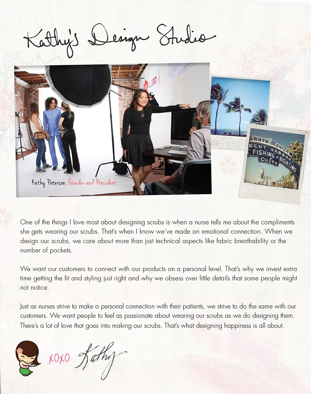 キャシー・ピーターソン氏はファッションデザイナーとして、Carol Little、Georges Merciano、デザインディレクターとして、スクラブブランドの大手BARCOにて数々の分野のユニフォームやスクラブを手掛けていました。働く中で医療用スクラブの着心地が悪く、デザイン性もよくないことに気づきました。そこでデザイン性や、着心地を重視したスクラブの需要を見出し、今風のおしゃれなスクラブを開発し販売することにしました。