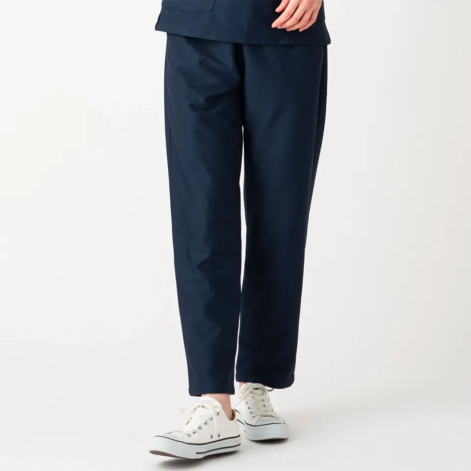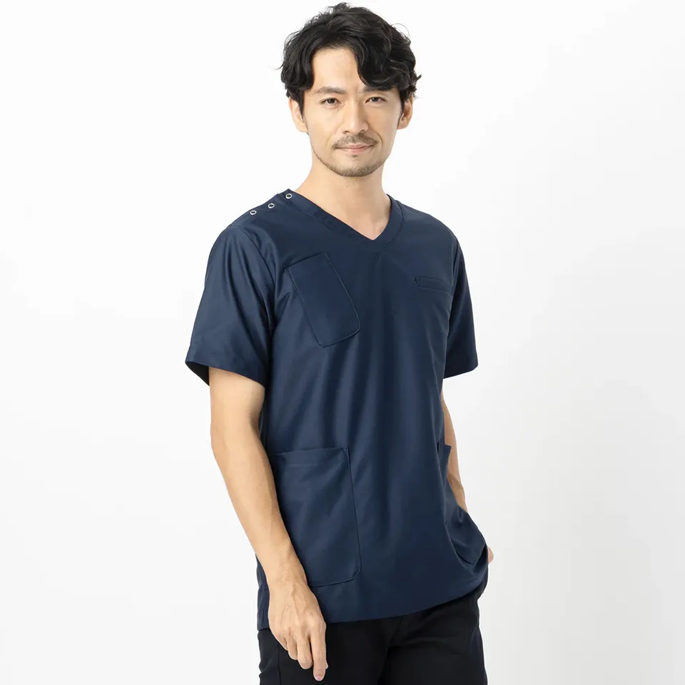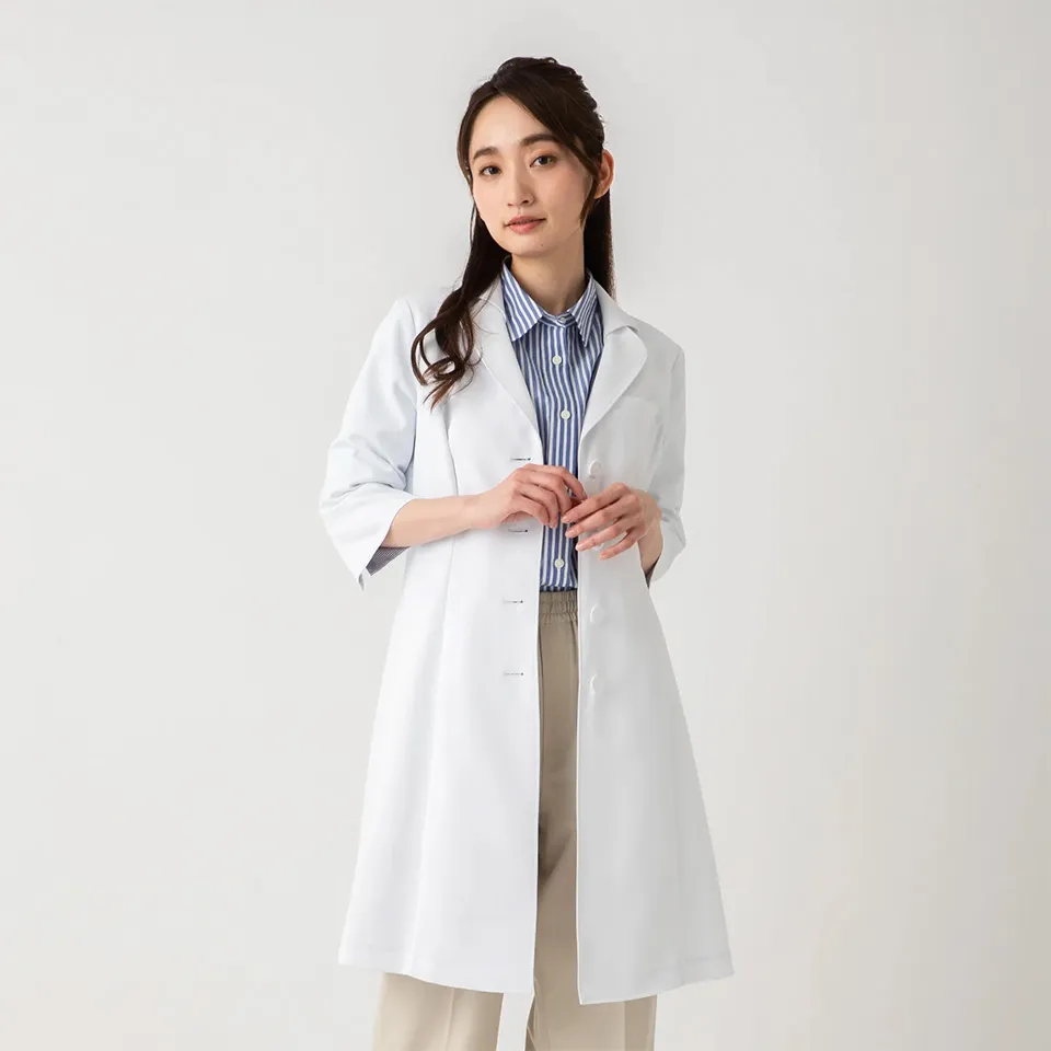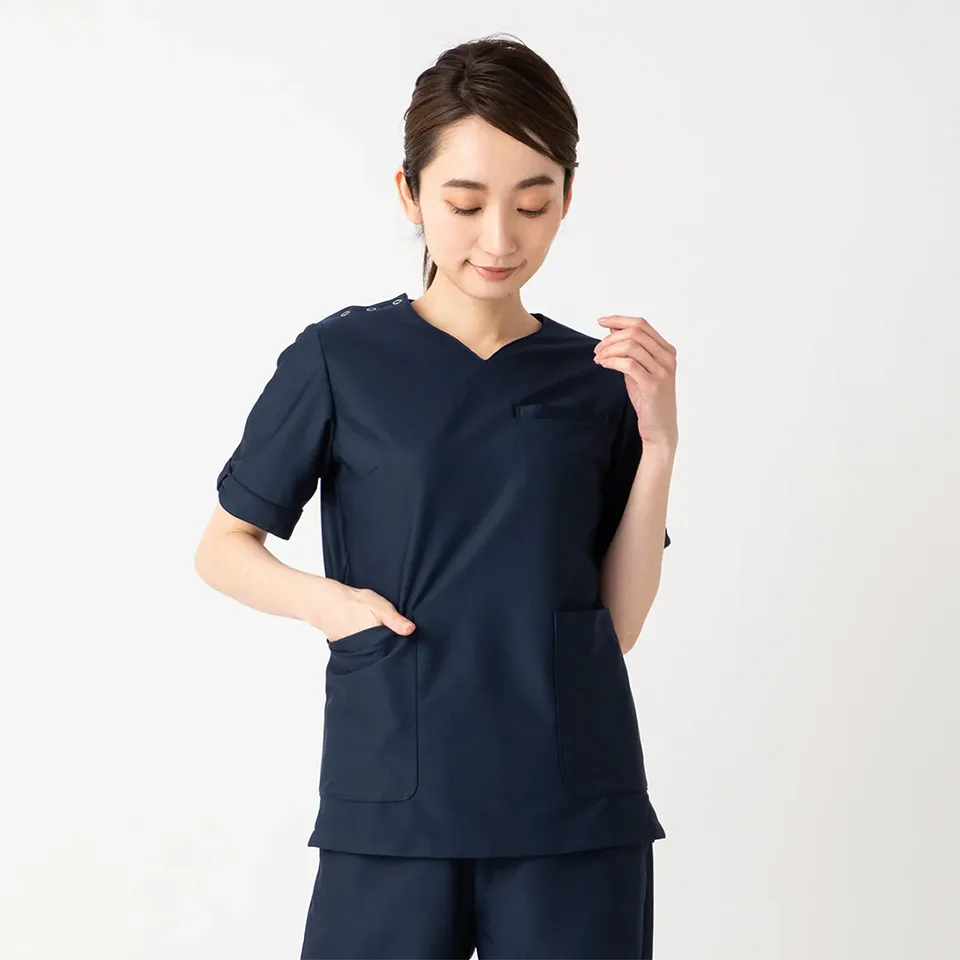 日本製の高機能な医療用素材を使用。たくさんの医師から意見を聞き、イージーケア・制電・透け防止・UVカット・吸湿速乾など、必要な機能を盛り込んでいます。加えて、軽さとハリ、柔らかさも兼ね備えているため、シルエットが美しく、着やすい素材となっています。