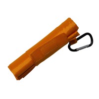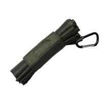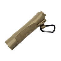 テープ付きでコンパクトに畳んで留められます。カラビナ付きで、リュックやベルトループなどに付けて持ち運びも簡単。