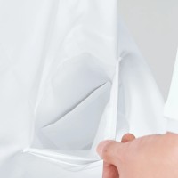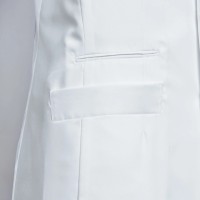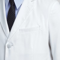 裏地、パイピングにもこだわりの白を使用。胸ポケットは適度な硬さのポケット縁でペンを差したり名札を付けても形が崩れません。両胸内側に内ポケット、両腰にタブレット端末も入る大型の方玉縁ポケット付き。