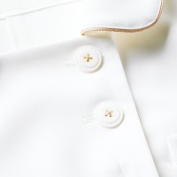 スタンダードなスタイルでありながら、上品な丸襟と胸元のボタン、ポイント使いのパステルカラーで凛としたエレガントさを演出するジャケットです。