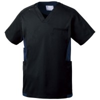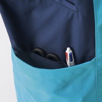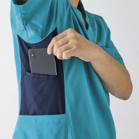 ソフトな肌触りで着心地もよく、丈夫な「ストレッチツイル」生地使用のスクラブ。制菌・制電加工が施されており、衛生面にも配慮された医療・福祉の現場にぴったりのスクラブです。脇のアクセントカラーがポイント。右脇ポケットは小型タブレット端末がすっぽり入って、持ち運びが便利です。右ポケットはペン差しポケット付。