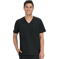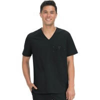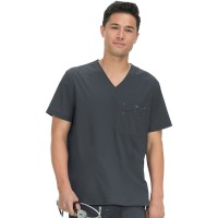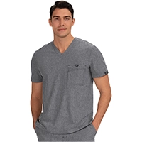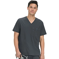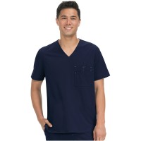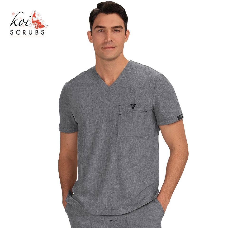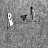 クラシックなVネックのメンズスクラブ。複数のコンパートメントを備えた胸ポケット。