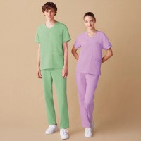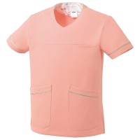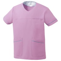 やわらかいカラーに上品なパイピングのアクセントが効いた男女兼用スクラブ。