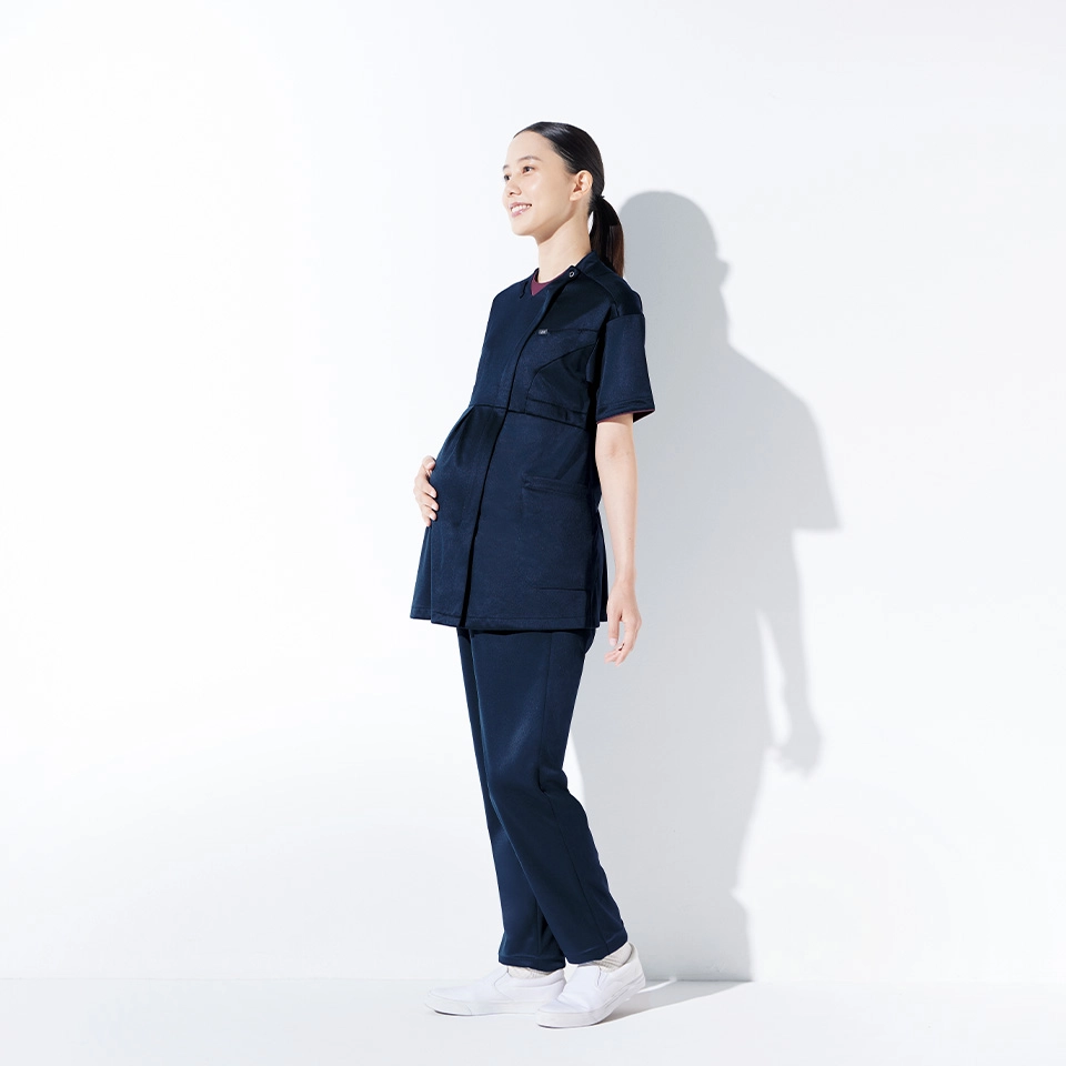 ウエストのタックやゴムギャザー使い、お尻がすっぽり隠れる長めの丈でお腹を優しく包みこむマタニティスクラブ。