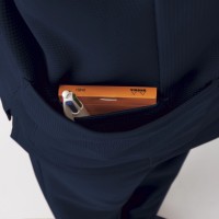 衛生面に配慮し、制菌加工を施した「ブロックニット」生地使用。小型タブレット端末がすっぽり収まる大きめのポケット。右側のポケットは中ポケットがついてて収納便利。