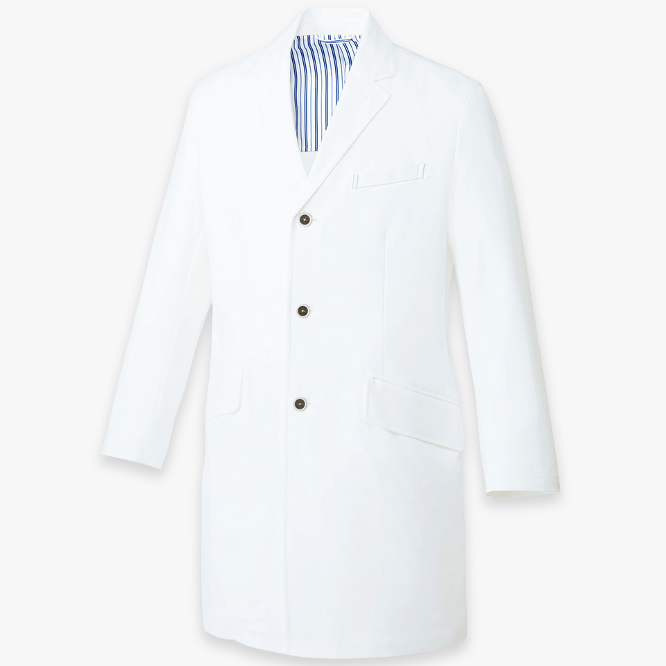 洗練された上質感を醸すスタイリッシュ素材で快適な着心地の長袖ドクターコート。