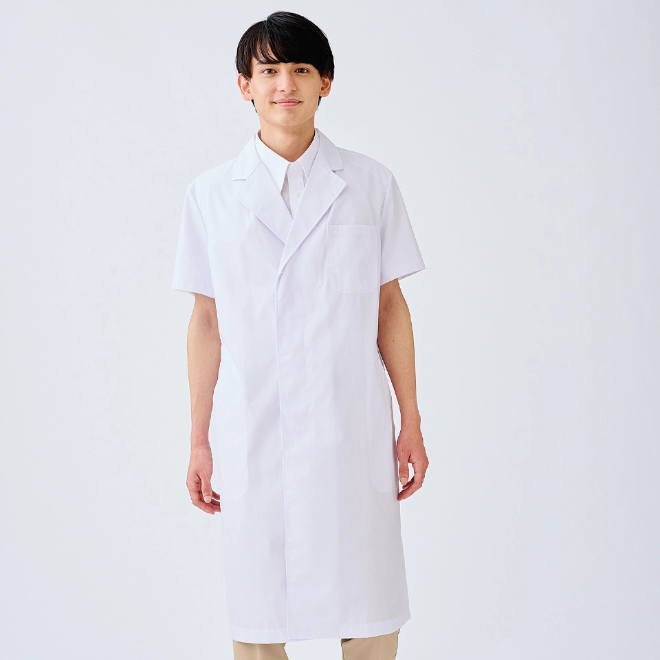 薄手でしなやかなポプリン素材を使用したシングルタイプのメンズ半袖ドクターコート。