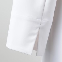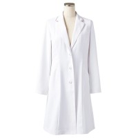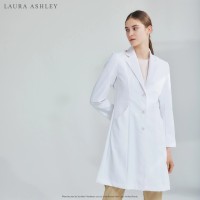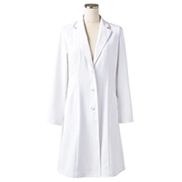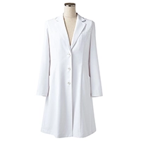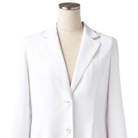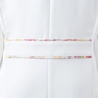 襟元とウエストベルトに花柄をあしらったフェミニンなドクターコート。