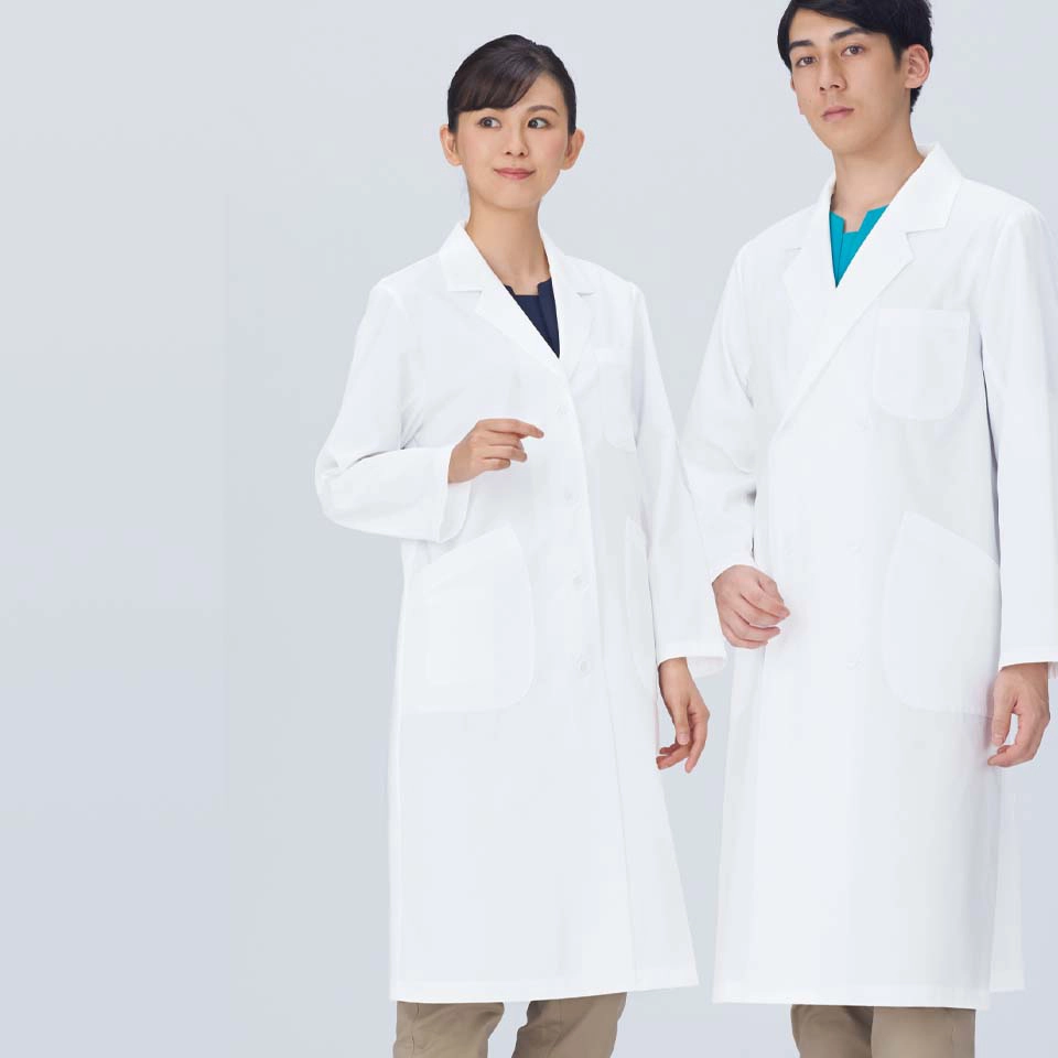 カラーはオフホワイトとサックスの2色。医療分野のみならず、幅広い分野で着用されています。