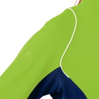 肩の柔らかな曲線のパイピングがアクセントで、袖口には太めのフライスがあります。