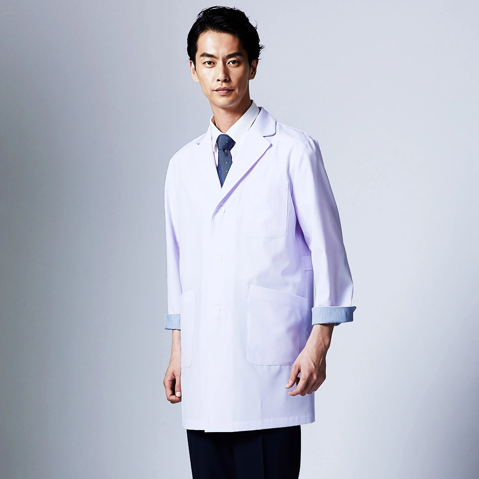 衿元と袖の見返しのストライプは新鮮な感じで、ドクターにも薬剤師さんにも最適です。