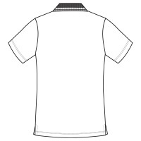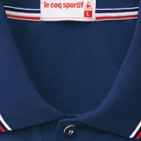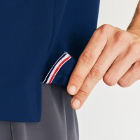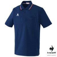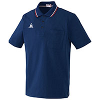 引き締め効果が期待できるネイビーのネックラインがポイントの男女兼用ポロシャツ。
