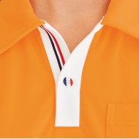 ネックラインをすっきり見せる襟元にはトリコロール柄のひとつボタンを。開いた部分にはトリコロールテープを取り付けました。