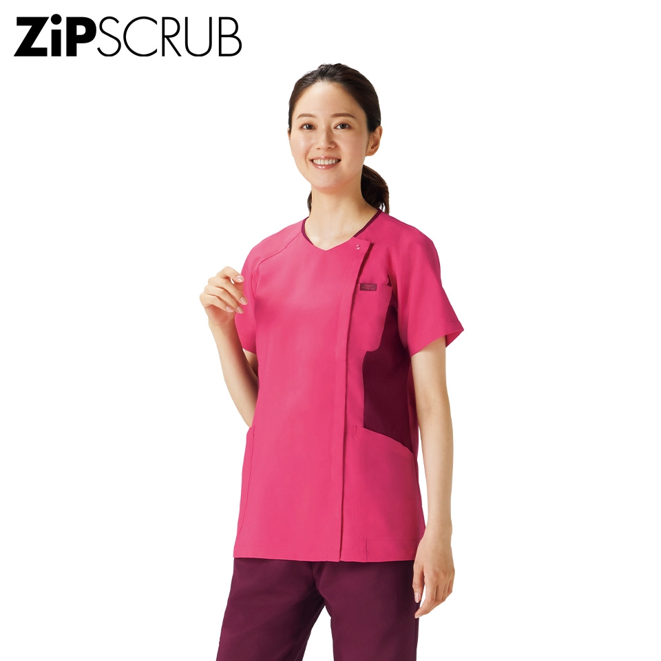 着やすさと動きやすさ抜群!羽織って着られるスタイリッシュなジップアップスクラブ。