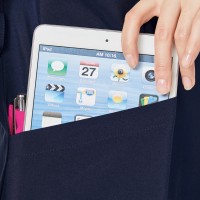アームホールに小さなショルダーバックをつけたような形状で、PHSやタブレットなどの重さが四方に分散されて動きを妨げません。PHSの出し入れがしやすいサイズと位置を考慮して、右脇にポケットを設けています。