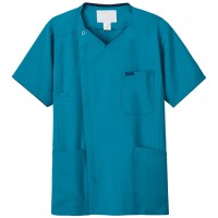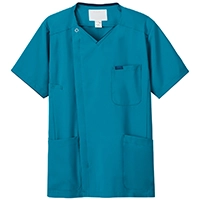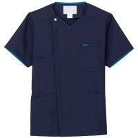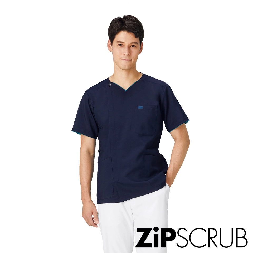 羽織って着るタイプのスクラブ。ジップ部分は男前立(右前)の合わせ。シャツやジャケットと同じ感覚で着られます。