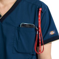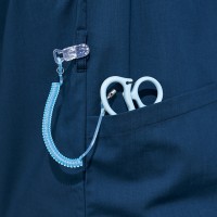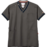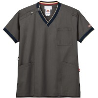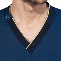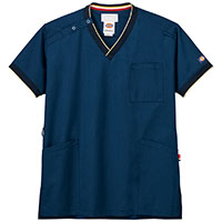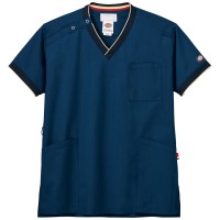 衿元と袖のリブにアクセントカラーをあしらったスポーティーなデザインの男女兼用スクラブ。
