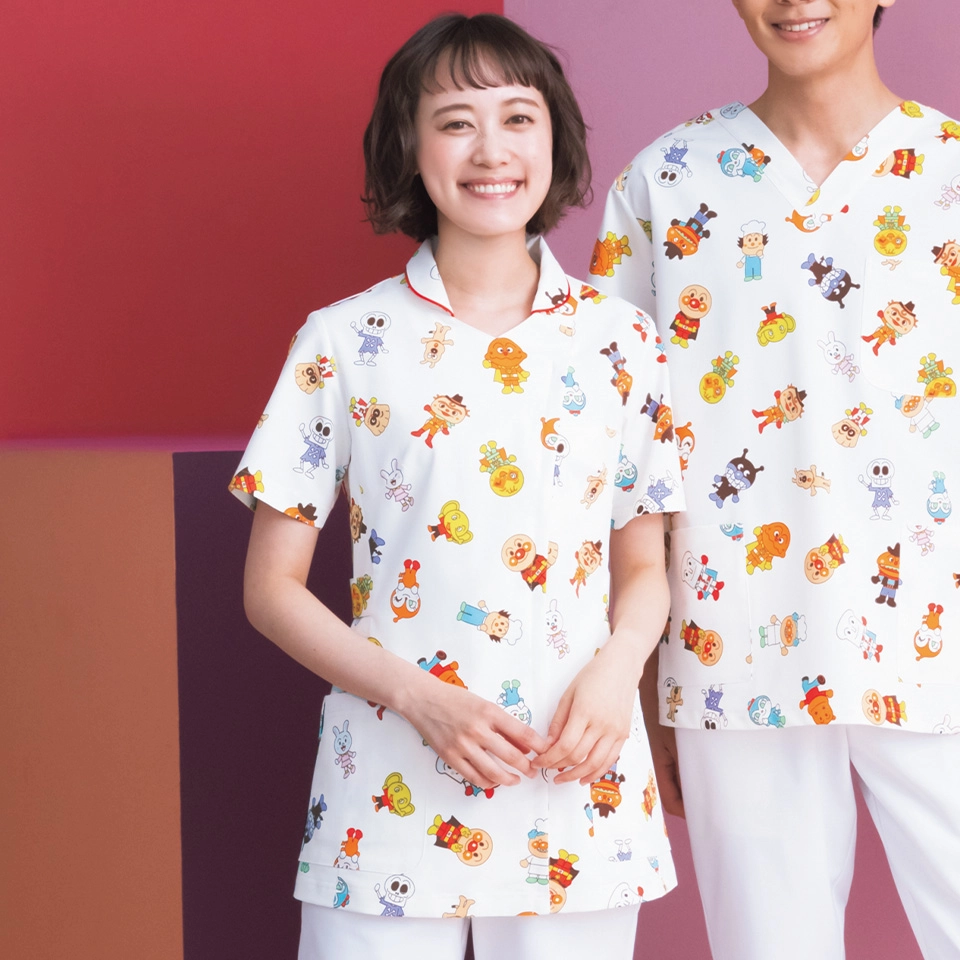 そんな思いを込めて、みんなが大好きなアンパンマンと仲間たちが登場する医療用ユニフォームをつくりました。
