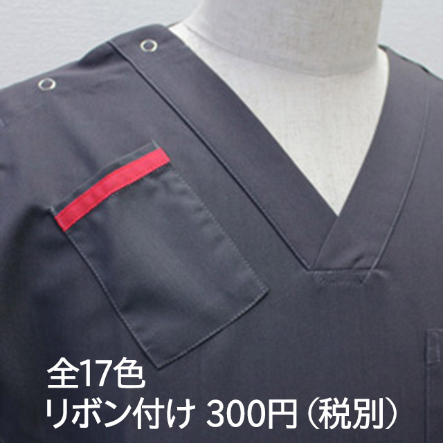 133スクラブにポケットとリボンが取り付けられます。リボンの色は17色!組み合わせも自由にできます。 メーカー取付の為、2週間~3週間程かかります。 ※ご希望のお客様は備考欄にご入力お願い致します。リボン付け希望のお客様はカラーをご指示ください。