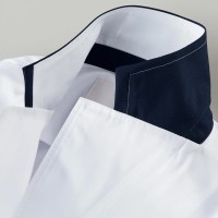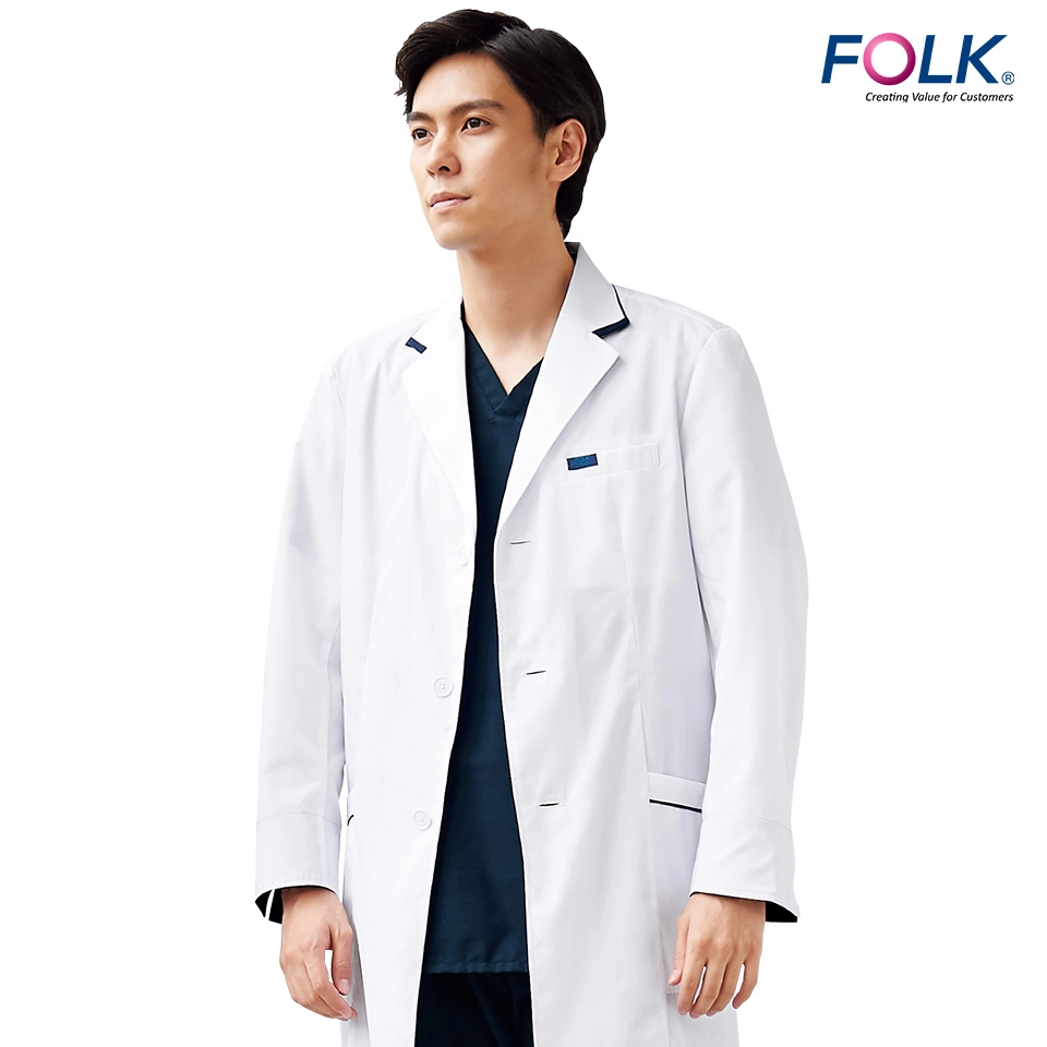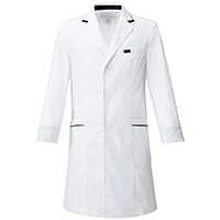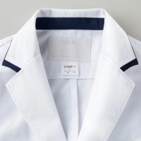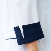 襟やポケット・袖口にアクセントカラーのネイビー色がはいったおしゃれなドクターコート