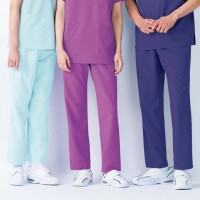 ポリエステル100%でありながら綿タッチの肌触りと優れた吸汗・速乾性をもつ、長時間の着用でも快適な高機能スラックス。ICU・ERなど手術現場もサポートします。133スクラブ(男女兼用)の合わせパンツです。