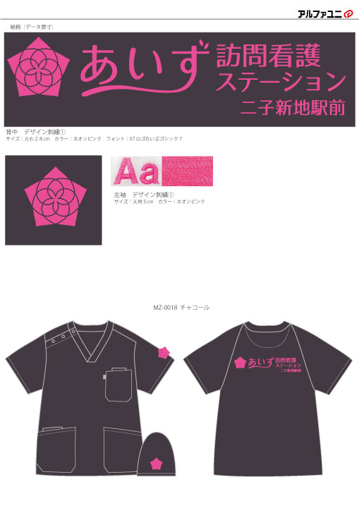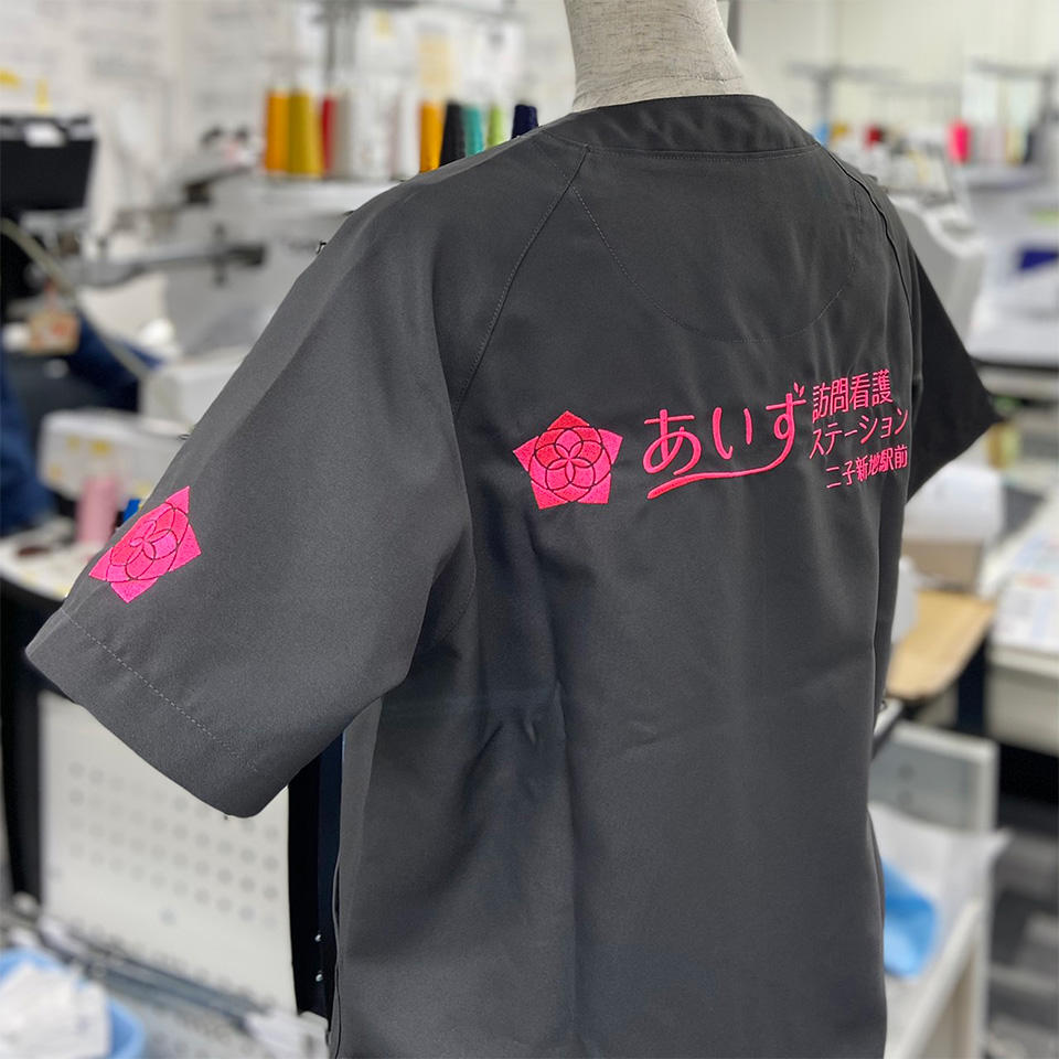デザイン刺繍 あいず訪問看護ステーション様 AランクDランクかわいい背中袖 あいず訪問看護ステーション様スクラブロゴマーク刺繍デザインのご紹介です。このたびは製作のご依頼ありがとうございました。 このデザインについて 【刺繍加工のポイント】 文字左側の5角形のオリジナルマークはしっかり高密度に打ち込みましたが、天地5cmサイズということで、それでも全体で116000針以内に収まり、結果として背中の刺繍代が平均的金額で納品することができました。 刺繍位置 :背中/左袖 刺繍サイズ:左右28cm/天地5cm 刺繍カラー:背中1色 ネオンピンク/左袖1色 ネオンピンク 使用スクラブ:MIZUNO MZ-0018スクラブ この記事をシェア