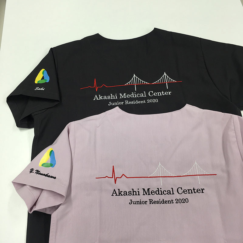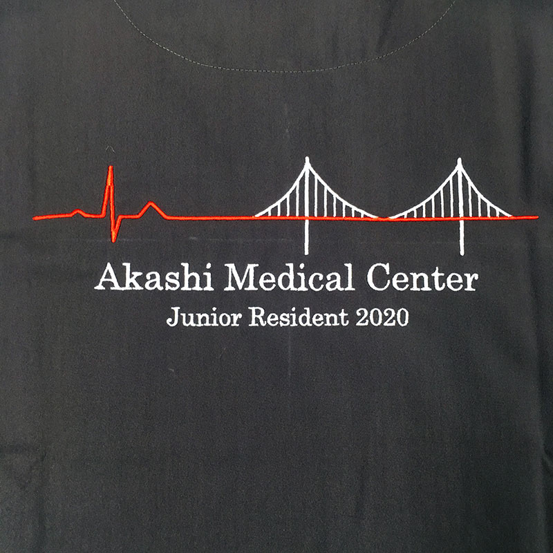 デザイン刺繍 明石医療センター2020様 Dランク心電図背中風景 明石医療センター2020様スクラブロゴマーク刺繍デザインのご紹介です。このたびは製作のご依頼ありがとうございました。 このデザインについて 【刺繍加工のポイント】 背中の2段文字のみ、刺繍カラー替えをしました。 刺繍位置 :背中 刺繍サイズ:左右28cm 刺繍カラー:2色 レッド・ホワイト 下2段刺繍:有り文字刺繍 書体:足付書体 その他加工:左袖CAM転写プリント 使用スクラブ:KAZEN133スクラブ チャコール、ローズ他 この記事をシェア