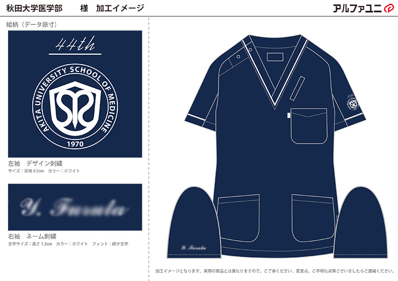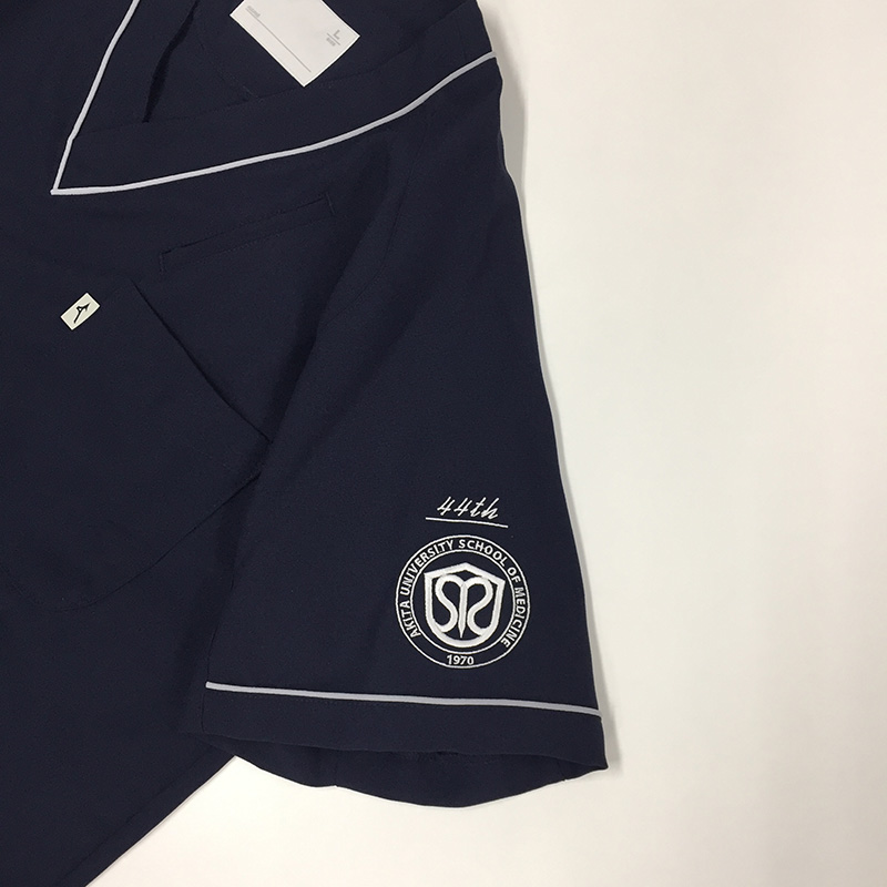 デザイン刺繍 秋田大学医学部44期卒業生様 MZ-0092 Dランク円形(丸型)デザイン校章袖 秋田大学医学部44期卒業生様スクラブシンボルマーク刺繍デザインのご紹介です。 製作のご依頼ありがとうございました。 このデザインについて 【刺繍加工のポイント】 袖刺繍は通常直径8㎝の円に収めるのですが、シンボルマークと44thの文字を合わせて 8.5cmになりましたが、スクラブの袖の仕様の関係もありなんとか8.5cmで刺繍することができました。 また、シンボルマーク部分は特に高密度でしっかり打ち込んでおりますので、盛り上がっておりしっかりと立体感が出ています。 刺繍位置 :左袖 刺繍サイズ:左右8.5cm(マークサイズ天地6.4cm) 刺繍カラー:ホワイト この記事をシェア