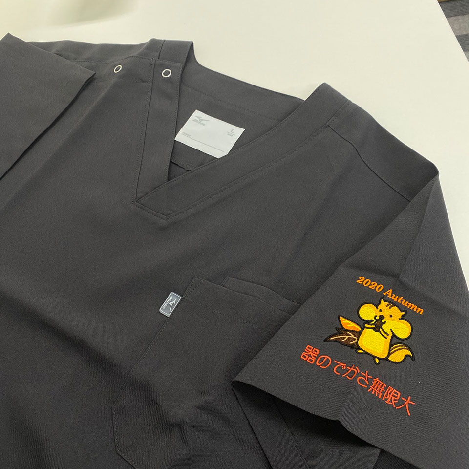 デザイン刺繍 総合病院国保旭中央病院2020様デザイン2 Bランクかわいい動物袖複雑タイプ 総合病院国保旭中央病院2020様スクラブロゴマーク刺繍デザイン2のご紹介です。このたびは製作のご依頼ありがとうございました。 デザインは2つあり、リスデザインのご紹介となります。 このデザインについて 【刺繍加工のポイント】 デザインに角があるため、円形の刺繍枠に収まるために縮小しましたが、左下の葉っぱが飛び出ている部分が円形の枠に収まるように若干配置を調整しました。 また、刺繍全体を引き締めるため、ダークブラウンの罫線でしっかり押さえました。 デザイン刺繍下の文字刺繍は、1度に刺繍できないので、2回に分けて刺繍しました。 刺繍位置 :左袖 刺繍サイズ:左右6cm 刺繍カラー:6色 S02.ブラック S11.オレンジ S12.ゴールドイエロー S13.サンフラワー S35.ライトブラウン S34.ダークブラウン この記事をシェア