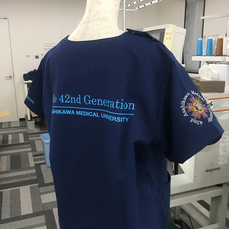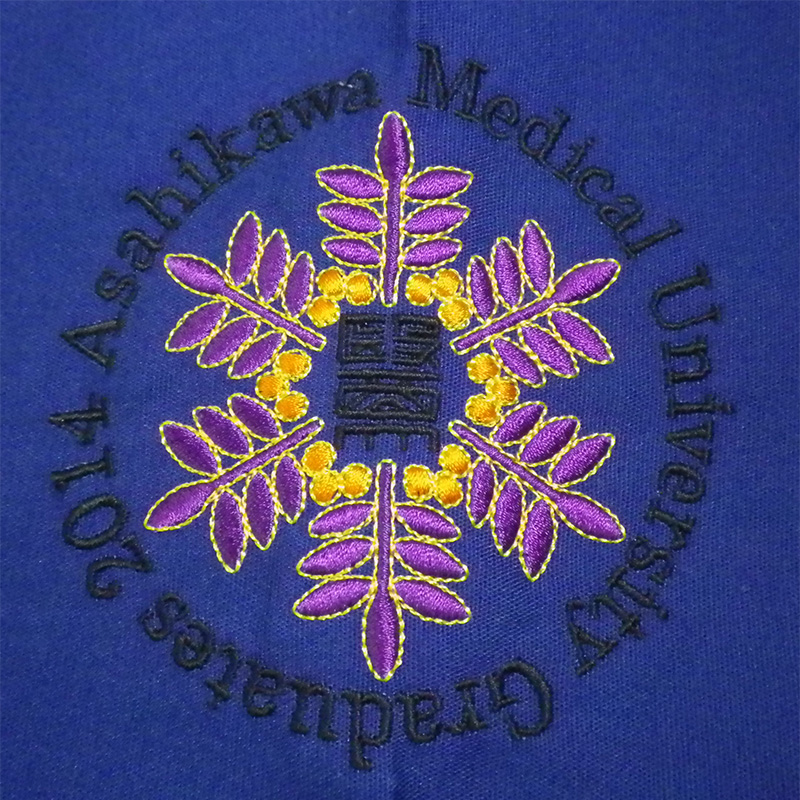 デザイン刺繍 旭川医科大学卒業生様 Cランク円形(丸型)デザイン卒業記念校章細かい文字袖複雑タイプ 旭川医科大学卒業生様スクラブロゴマーク刺繍デザインのご紹介です。 2014年から2020年までほぼ毎年製作のご依頼をいただいております。 校章を刺繍しますが、年数や期数を代ごとに修正しております。 いつもご依頼いただきありがとうございます。 このデザインについて 【刺繍加工のポイント】 刺繍デザインがかなり複雑です。 そのため、高い刺繍型作成の技術が必要であり、それなりに刺繍型代が高価なものとなります。 葉の部分をステッチで囲っていますが、ずれることなく綺麗に仕上がっています。 数字の修正のみに抑えることで刺繍型代の負担を最小限に軽減し、製作をさせていただいております。 刺繍位置 :左袖 刺繍サイズ:左右7.8cm 刺繍カラー:4色 バイオレット、オレンジ、イエロー、ホワイト(orブラック) 背中はシルクプリントを施しました。スクラブカラーに合わせて色替え対応をしました。 使用スクラブ:KAZEN 133スクラブ この記事をシェア