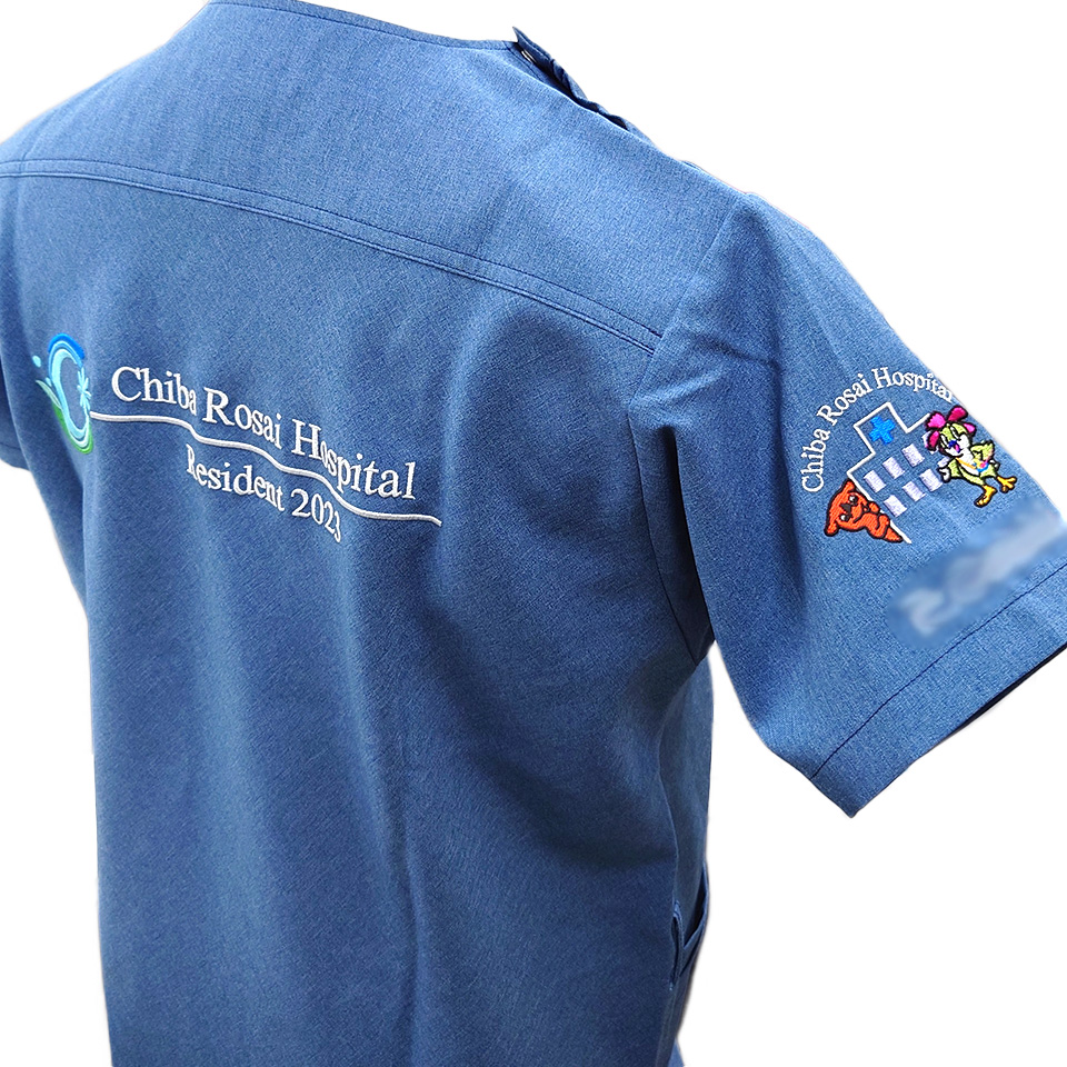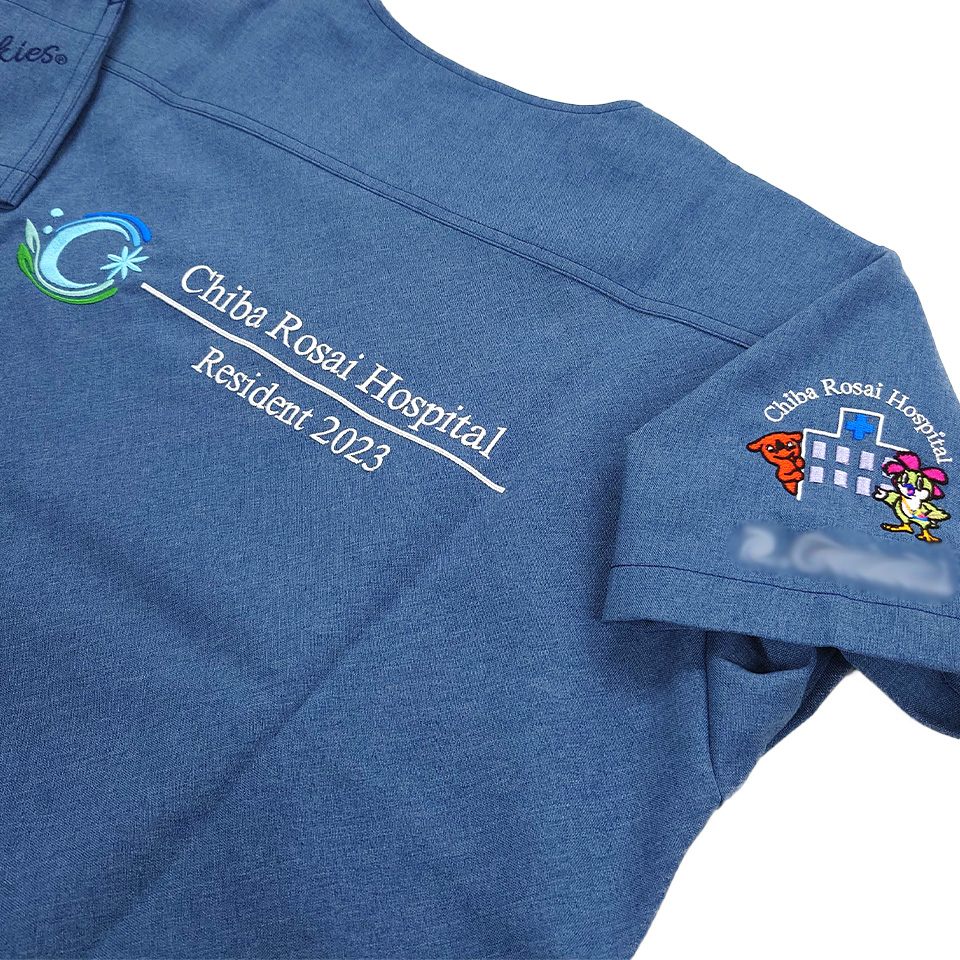 デザイン刺繍 千葉ろうさい病院2023年研修医様 右袖刺繍デザイン 7061SC カラフルかわいいキャラクター建物袖複雑タイプ 千葉ろうさい病院2023年研修医様スクラブ右袖刺繍デザインのご紹介です。このたびは製作のご依頼ありがとうございました。 このデザインについて 【刺繍加工のポイント】 キャラクターのアウトラインの罫線の太さは太く見えますが、実際に約0.8㎜です。 線の中の、オブジェクトの刺繍がはみ出ないようしっかり縁取りで押さえるためです。 小さく細かいデザインですが、全部で10色使用しています。 刺繍位置 :右袖 刺繍サイズ:左右7.5cm 刺繍カラー:10色 ホワイト・ブラック・ホットピンク・イエローグリーン・ゴールドイエロー・イエロー・ブルー・ロイヤルブルー・ラベンダーグレー + チーバくん指定色レッド 使用スクラブ:Dickies 7061SCスクラブ その他7072SCスクラブ、7033SCスクラブも使用。 この記事をシェア