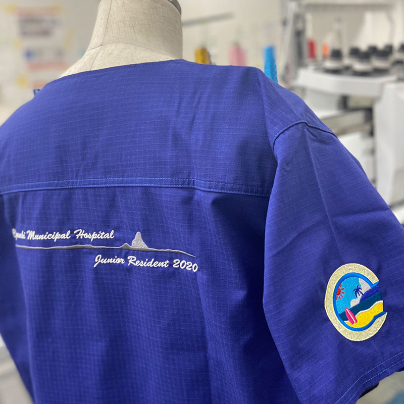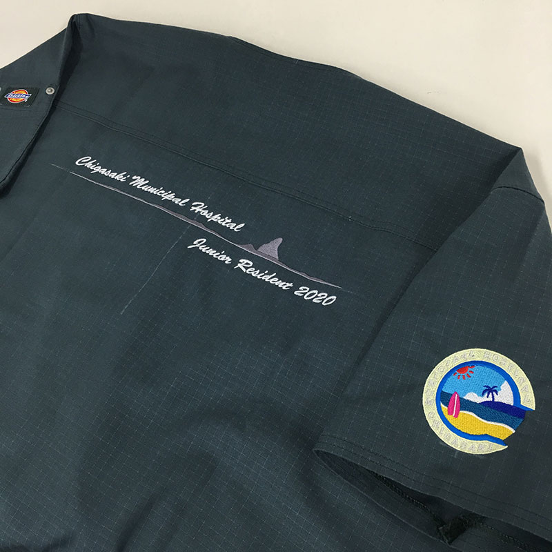 デザイン刺繍 茅ヶ崎市立病院2020様 BランクDランクカラフル円形(丸型)デザイン背中袖複雑タイプ風景高運針数デザイン 茅ヶ崎市立病院2020様スクラブ刺繍デザインのご紹介です。 製作のご依頼ありがとうございました。 このデザインについて 【刺繍加工のポイント】 ■左袖の刺繍デザインについて デザインがすべて糸で埋められているデザインとなり、非常にまれなパターンです。 当然ながら打ち込み本数も相当な数字となりました。 左袖の針数 約20000針 本来大きさ的に背中の方が針数が多くなるのですが、こちらのデザインは背中よりも針数が多くなっています。 また、たたみ打ちの糸の角度を微妙に変えることで立体感を出しています。 ■背中のデザインについて 海水面(波)と烏帽子岩については同じダークグレーの糸を使用していますが、打ち方をサテン打ちとたたみ打ちで変えることによって、レイヤー分けを意識しています。 それにより遠近感が出ています。 刺繍位置 :左袖/背中 刺繍サイズ:左袖 天地6.5cm/背中 左右28㎝ 刺繍カラー:左袖10色 S15.パステルイエロー・S28.サックス・S04.ライトグレー・S01.ホワイト・S07.レッド・S13.サンフラワー・S25.ロイヤルブルー・S26.オーシャン・S27.ブルー・S08.ホットピンク 背中2色 S01.ホワイト・S03.ダークグレー 使用スクラブ:Dickies(ディッキーズ)7045SC スクラブ この記事をシェア