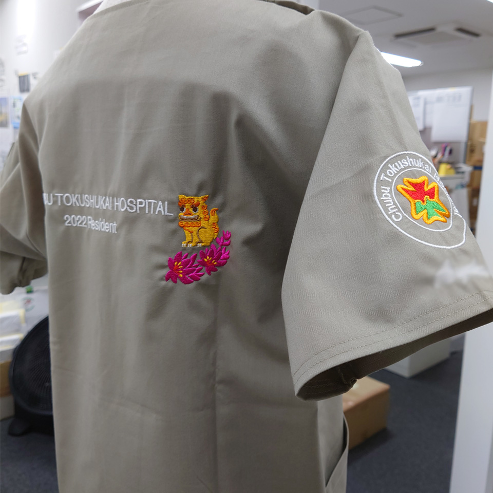 背中には沖縄の象徴シーサーとハイビスカスの可愛いイラストを刺繍、袖には徳洲会様のロゴマークを刺繍しました。