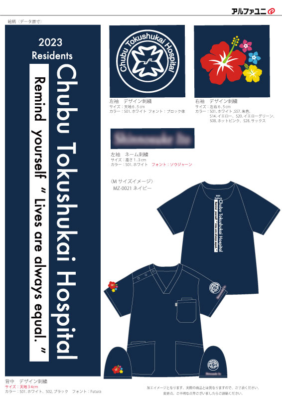 デザイン刺繍 中部徳洲会病院様 背中刺繍デザイン 縦長デザインかっこいい刺繍動画あり背中高運針数デザイン 中部徳洲会病院様スクラブ背中刺繍デザインのご紹介です。 背中中央に縦長のデザインを刺繍しました。こちらのような縦長の刺繍をするためには、通常とは別の形状の枠を使用します。 このたびは製作のご依頼ありがとうございました。 このデザインについて 【刺繍加工のポイント】 通常背中など大きい刺繍加工で使用する枠は横長のものですので、左右は30cm~MAX3で35cmくらいまで刺繍できるのですが、天地(高さ)は最大でも20cmが限界サイズとなります。 そのため、このようなデザインの場合は縦長専用枠で刺繍をします。それによって天地35cmまで加工が可能となります。 また、帯の中の文字は抜きのように見えますが、ブラックの糸でしっかり埋めています。 帯をすべて埋めていることもあり、針数としては3万針を超えました! 25000針オーバーの背中の刺繍を、アルファユニでは「インパクト刺繍」というランク名称で、今後ホームページでも発信して行きます。 ちなみにインパクト刺繍の下ランクは「こだわり刺繍」です。 刺繍位置 :背中 刺繍サイズ:天地35cm 刺繍カラー:2色 ホワイト・ブラック 使用スクラブ:MIZUNO MZ-0021スクラブ この記事をシェア