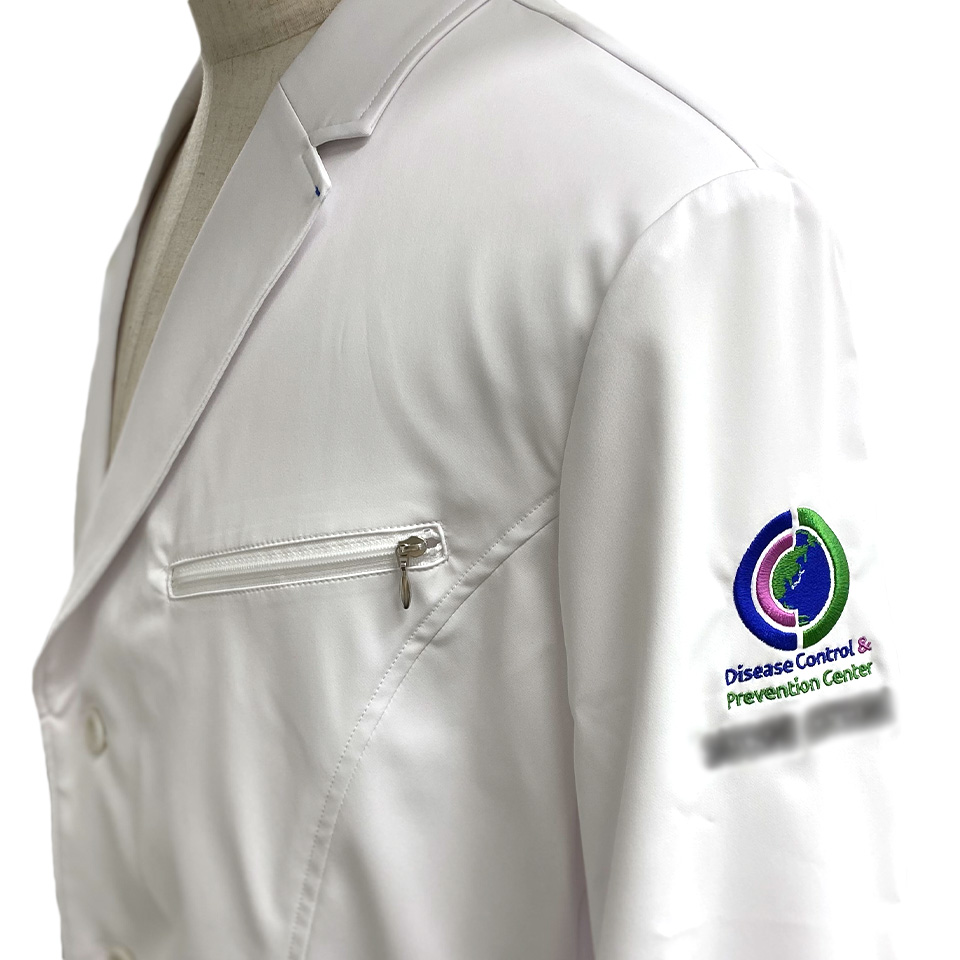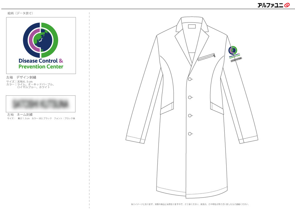 デザイン刺繍 国際感染症センター様 白衣左袖刺繍デザイン ドクターコート細かい文字袖複雑タイプ 国際感染症センター様白衣左袖刺繍デザインデザインのご紹介です。このたびは製作のご依頼ありがとうございました。 このデザインについて 【刺繍加工のポイント】 デザイン内の世界地図のイラストはかなり細かく、中央にある日本列島の地図については、なんとか日本とわかるレベルで再現できました。しかし、これが限界ですし、お客様にNGと言われた場合は拡大をさせていただくようお願いしております。 また、デザインの外側にある帯の太さについて、幅6.5cmとなっておりますが、サテンステッチでの縫い幅の限界が7mm程度となりますので、こちらもほぼ太さの限界となります。7mm以上のサテンは、着用時に引っかけてしまうリスクが高いため、通常は行っていません。7mmを超える線のデザインは、たたみステッチに変換します。 刺繍位置 :左袖 刺繍サイズ:天地6.5cm 刺繍カラー:4色 ライム・オーキッドパープル・ロイヤルブルー・ホワイト 使用白衣:JUNKO KOSHINO JK191-11 メンズ(テーラーカラー/ロング) この記事をシェア