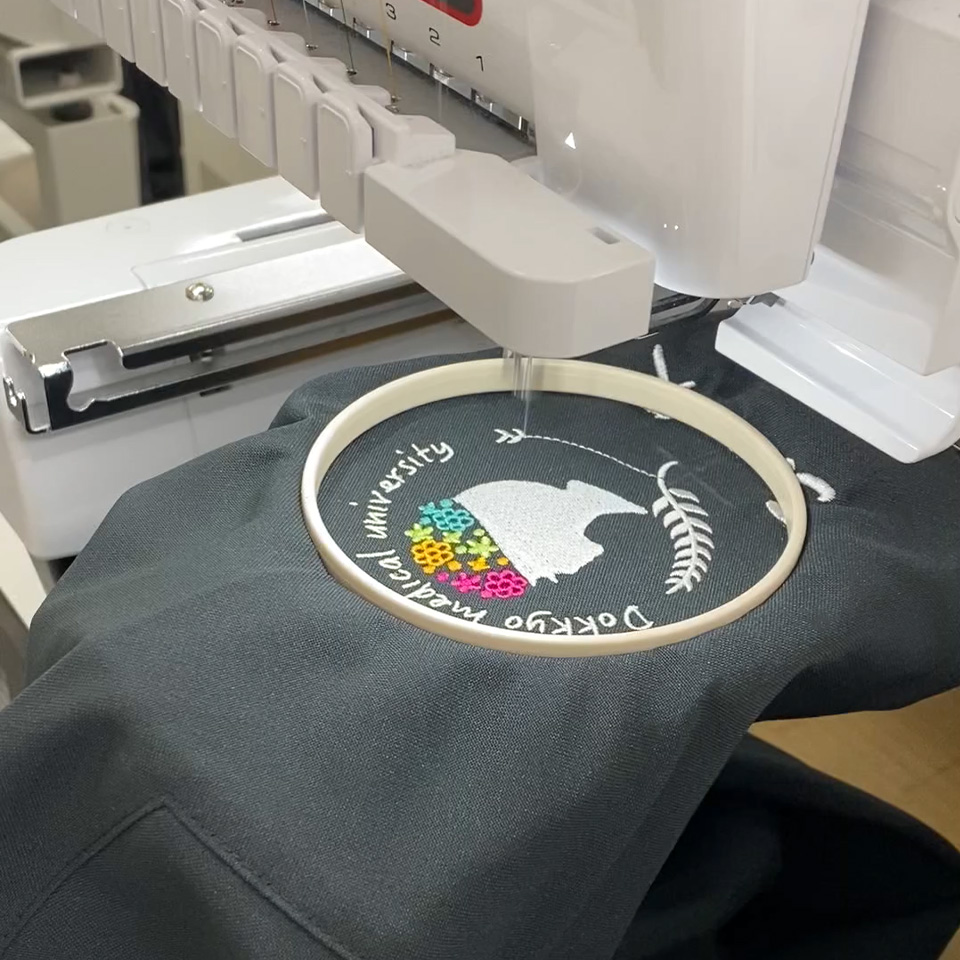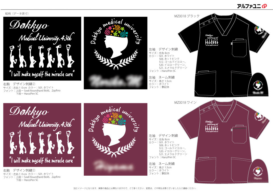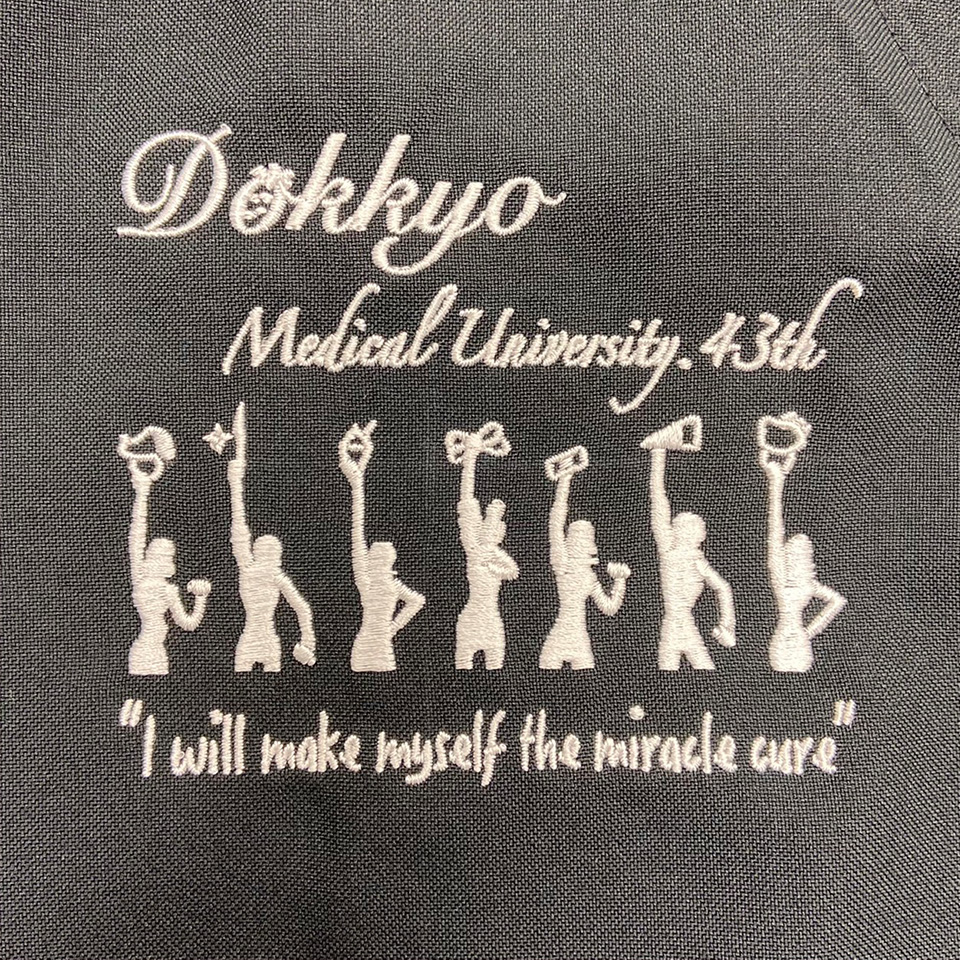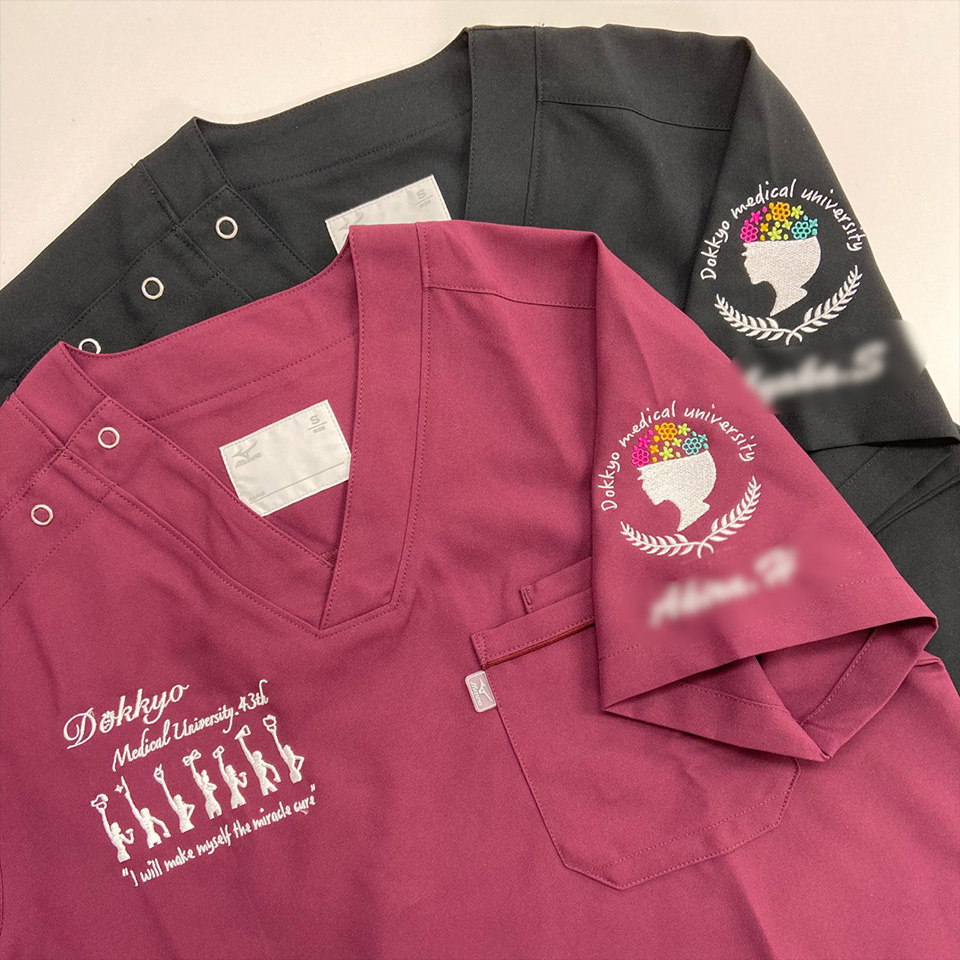 デザイン刺繍 獨協医科大学43期生様 MZ-0018 月桂樹Cランク円形(丸型)デザイン細かい文字胸花袖複雑タイプ 獨協医科大学43期生様スクラブロゴマーク刺繍デザインのご紹介です。このたびは製作のご依頼ありがとうございました。 このデザインについて 【刺繍加工のポイント】 人の横顔部分はたたみ打ち、それ以外の部分は全てサテン打ちとなっています。 左袖、右胸とも文字もイラストも細かい表現ばかりですので、通常よりも細い糸(75D)と細い針を使用しています。 また、スクラブMZ-0018であることも細かいデザインが綺麗に再現できる要素となっています。 生地自体の糸密度が高いため、刺繍の針があまりぶれないことでアウトラインが綺麗に仕上がります。 スクラブ刺繍位置:左袖デザイン刺繍、ネーム刺繍/右胸デザイン刺繍 スクラブ刺繍サイズ:左袖デザイン刺繍左右8cm、ネーム刺繍高さ1.5cm/右胸デザイン刺繍左右10cm スクラブ刺繍カラー:左袖デザイン刺繍5色 ホワイト・ホットピンク・ゴールドイエロー・イエローグリーン・エメラルドグリーン、ネーム刺繍1色 ホワイト/右胸デザイン刺繍1色 ホワイト 使用スクラブ:MIZUNO MZ-0018スクラブ この記事をシェア