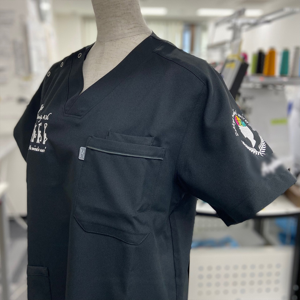 スクラブ刺繍位置:左袖デザイン刺繍、ネーム刺繍/右胸デザイン刺繍