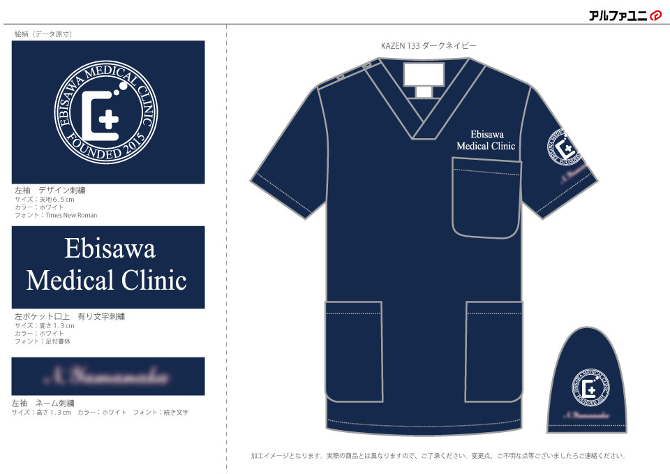 デザイン刺繍 えびさわ内科クリニック様 Cランク円形(丸型)デザイン袖 えびさわ内科クリニック様スクラブロゴマーク刺繍デザインのご紹介です。このたびは製作のご依頼ありがとうございました。 このデザインについて 【刺繍加工のポイント】 円形の中の小さな2つの塗りつぶしの丸のサイズは大きいほうで5mm、小さいほうで約3mmです。 3mmの丸について、何とか円形と言えるレベルで再現できていますが、これより小さい丸は円形を保つことが難しくなり、どうしても歪んでしまいます。 刺繍位置 :左袖/左ポケット口上 刺繍サイズ:左袖デザイン刺繍 天地6.5㎝、ネーム刺繍 高さ1.3㎝/ポケット口上有り文字刺繍 高さ1.3㎝ 刺繍カラー:ホワイト 使用スクラブ:KAZEN 133スクラブ この記事をシェア