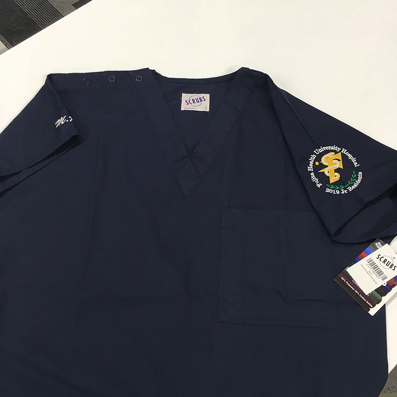 デザイン刺繍 藤田医科大学附属病院2019様 Cランク円形(丸型)デザイン袖 藤田医科大学附属病院2019様スクラブロゴマーク刺繍デザインのご紹介です。このたびは製作のご依頼ありがとうございました。 このデザインについて 【刺繍加工のポイント】 袖センターに縫い目が走っていますが、問題なく刺繍できます。 縫い目をしっかり刺繍で押さえることで歪みのない円形となっています。 文字のカラーについてはホワイトに見えますが、実際にはシルバーの糸を使用しています。 刺繍位置 :左袖 刺繍サイズ:左右7.8cm 刺繍カラー:3色(MAX) シルバー、ゴールド、イエローグリーン 使用スクラブ:S.C.R.U.B.S. Z1004 3ポケットトップ NVY(ネイビー) この記事をシェア